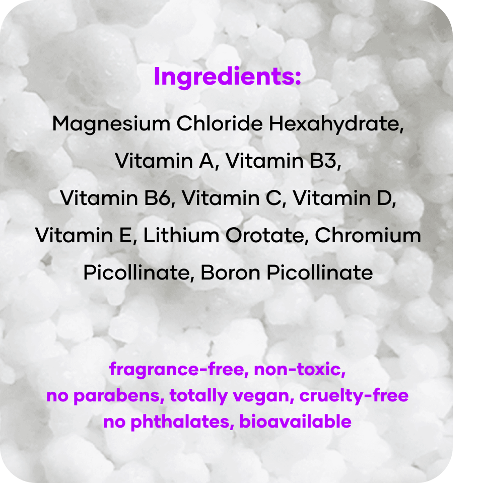 Insomnia Ending Anti-Stress Bath Treatment: Magnesium Chloride Hexahydrate (47% Concentration), Retinyl Palmitate (Vitamin A), Tocopheryl Acetate (Vitamin E), L-Carnitine (Plant-derived), Calamus Oil, Mandarin Oil, Citral, Linalool, D-limonene